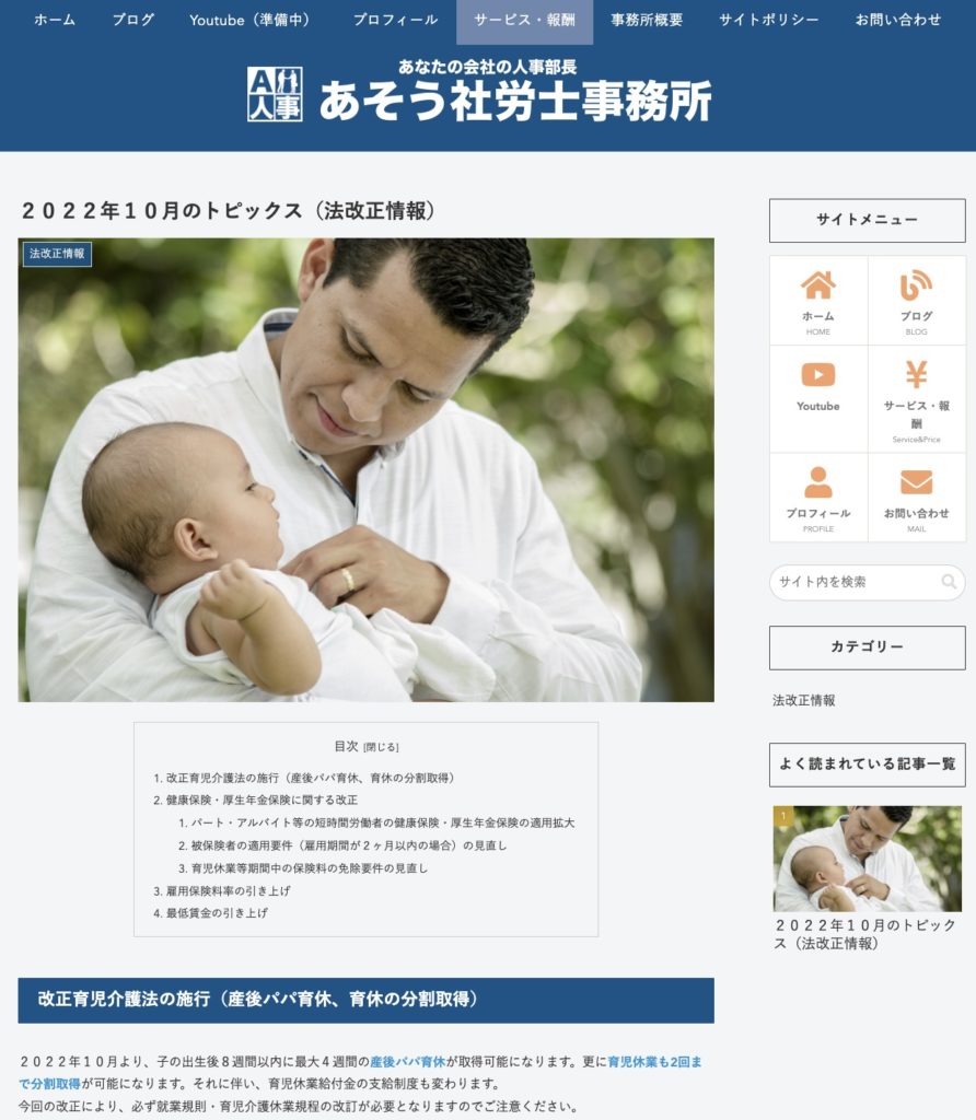 ホームページにはブログも実装して、とりあえず「2022年10月の法改正情報」を簡単に書いてみました。”産後パパ育休”の内容に相応しいアイキャッチ画像を探すのに1時間近くかけてしまったのは内緒です・・・。(笑)